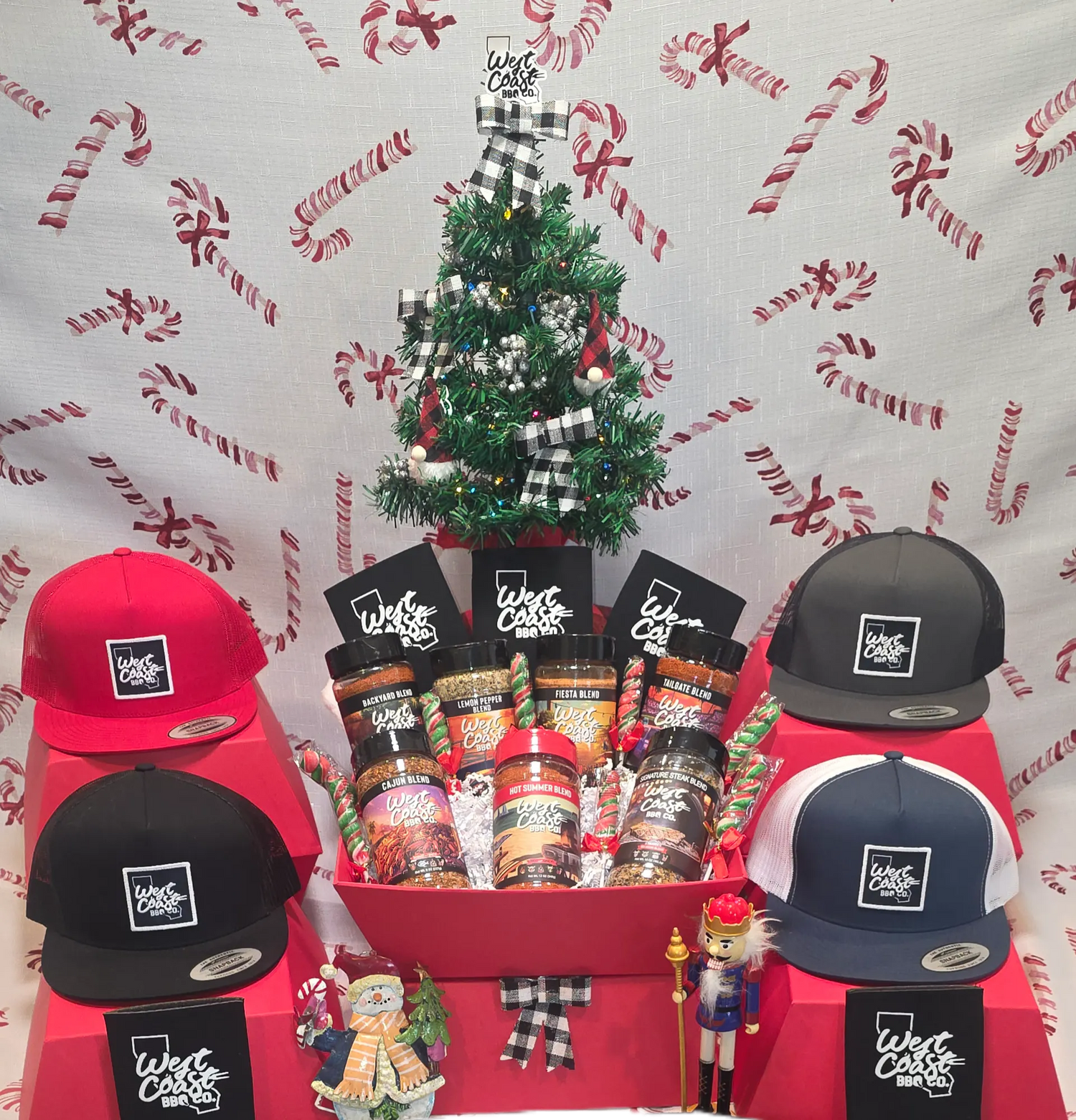 Build a fully personalized BBQ basket packed with your favorite West Coast BBQ Co. rubs and blends. Every basket includes free stickers and coozies, and your holiday rewards stack as you add more: